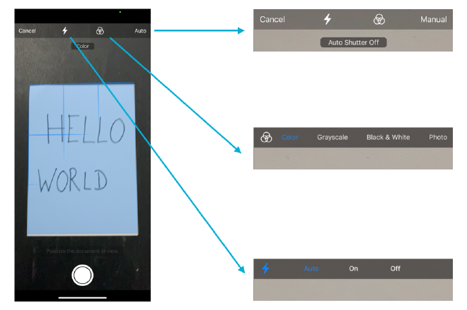 - The shutter behaviour can also be changed. Whenever the camera “thinks” that it has recognised a document it will automatically “press” the shutter (default). In case we really want to press the shutter button ourselves, this needs to be set to “Manual”.
